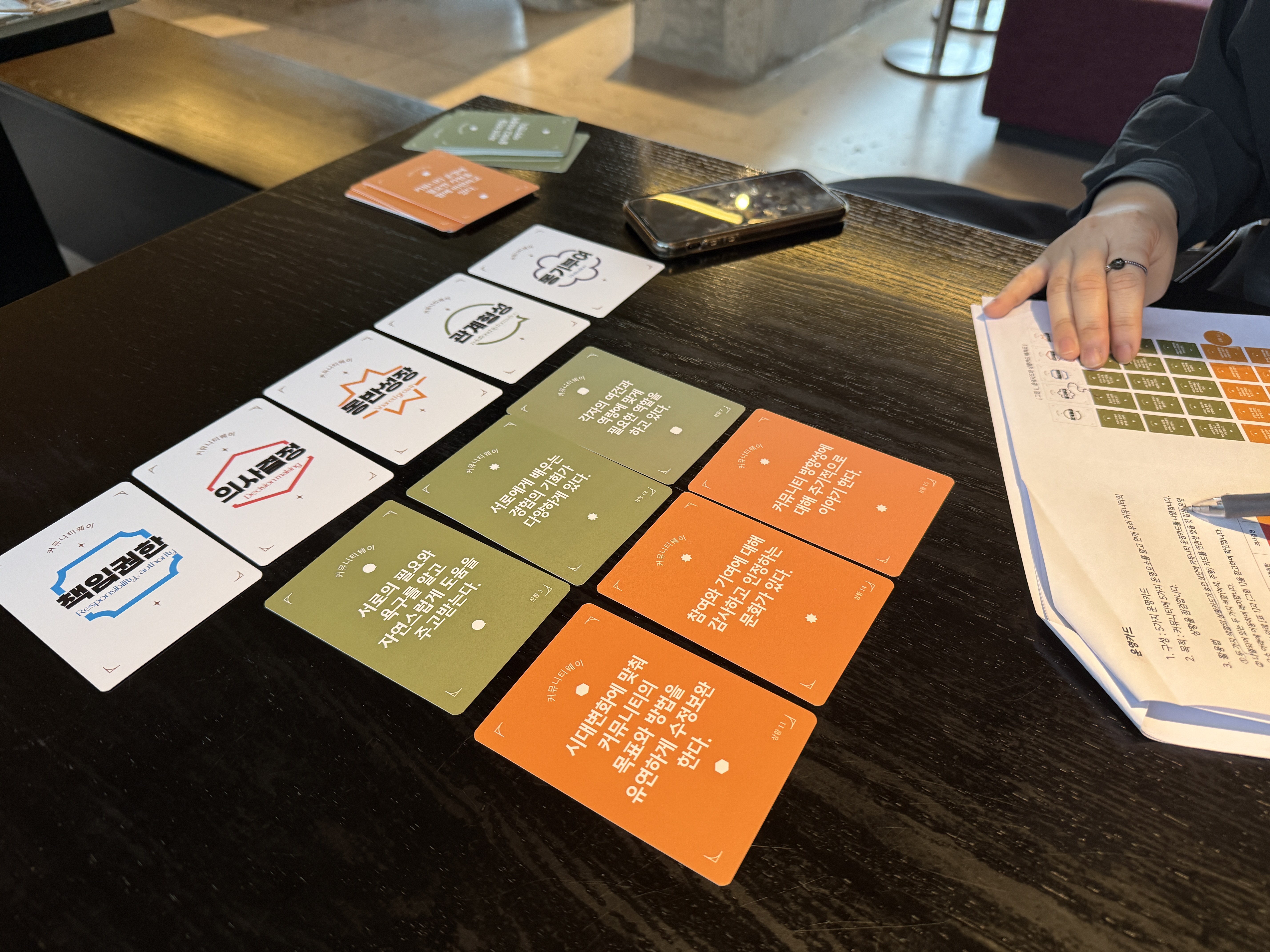 오륜동 회동수원지에서 함께 점심을 먹고 황톳길 산책을 한 후 간단한 팀회의 후 '지리산 이음'의 커뮤니티웨이 카드를 활용한 워크숍을 했답니다. 우리 조직이 잘하고 있는 점은 무엇인지, 무엇이 부족한지, 부족한 점을 보완하려면 어떤 행동이 필요할지. 소규모 커뮤니티웨이 워크숍을 통해 많은 생각들을 나누는 의미있는 시간이었습니다.