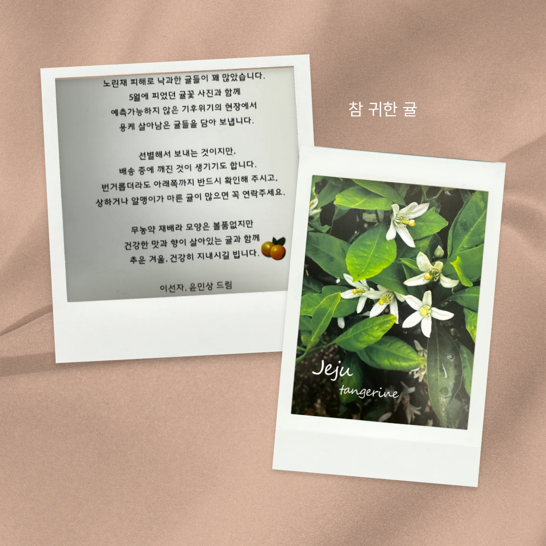 귤 박스 안에는 제주 농부가 함께 동봉한 카드도 들어 있었어요. 카드를 읽다 보니 '애지중지 키운 우리 아이, 잘 부탁해요'라고 말하는 것 같아 그 마음을 함께 나누고 싶어졌어요.